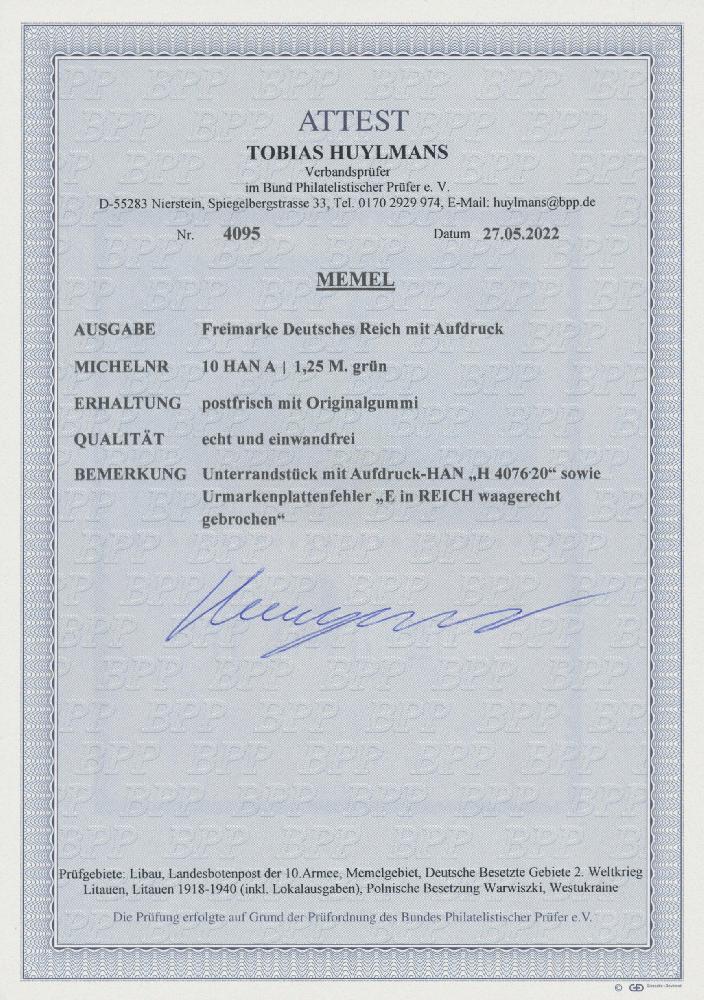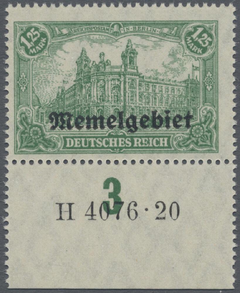 | Zusatzinformationen und Suchstichworte: | Christoph Gärtner 56. Auktion 12. - 16. Juni 2023 Los 5539 D Memel 1920, Freimarke Deutsches Reich 1,25 M mit Aufdruck, postfrisch vom unteren Bogenrand mit Aufdruck-HAN "H 4076.20" sowie dem Urmarken-Plattenfehler "E in REICH waagerecht gebrochen"(DR 113 I Feld 48), mit aktuellem Foto-Attest Huylmans, BPP(2022): "echt und einwandfrei". Bei Memel bisher nicht katalogisiert, seltene Gelegenheit! Ausruf 300,00 EUR |