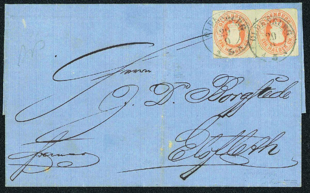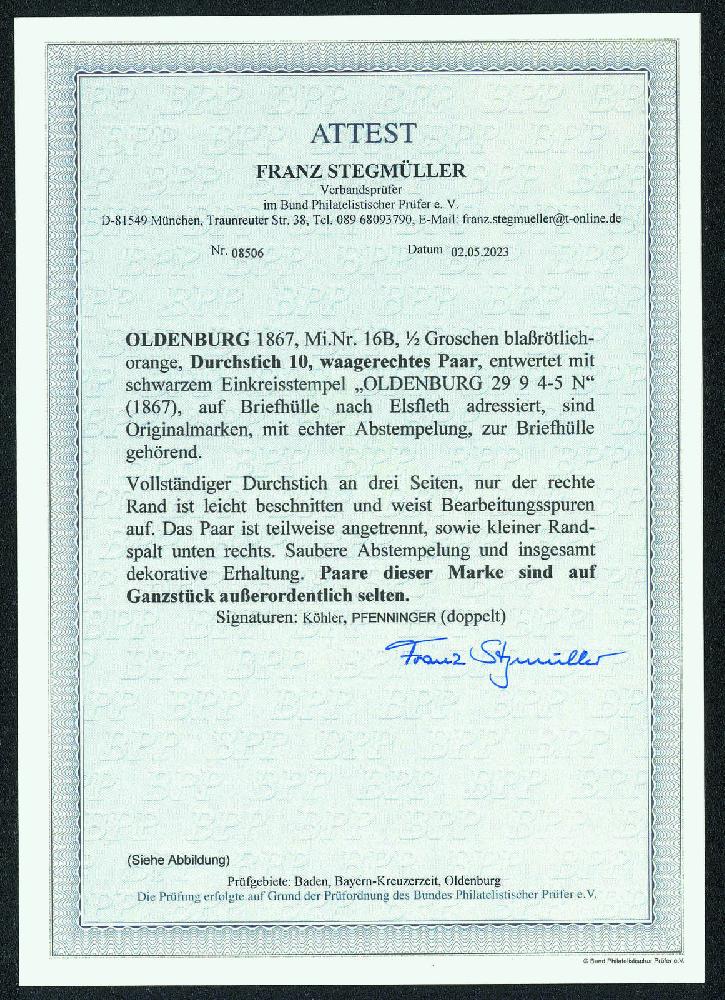 | Zusatzinformationen und Suchstichworte: | Gert Müller 119. Auktion 24. - 26. August 2023 Los 2538 Altdeutschland Oldenburg 1/2 Gr. blassrötlichorange, seltener Durchstich 10, waagerechtes Paar mit vollständigem Durchstich an drei Seiten, rechter Rand leicht beschnitten und Bearbeitungsspuren, teilweise angetrennt, sowie kleiner Randspalt unten rechts, als außerordentlich seltene Mehrfachfrankatur auf Brief mit zwei klaren schwarzen K1 "OLDENBURG 29.9.(1867)" nach Elsleth. Neues Fotoattest "PAARE DIESER MARKE SIND AUF GANZSTÜCK AUßERORDENTLICH SELTEN" Stegmüller BPP Ausruf 500,00 EUR |