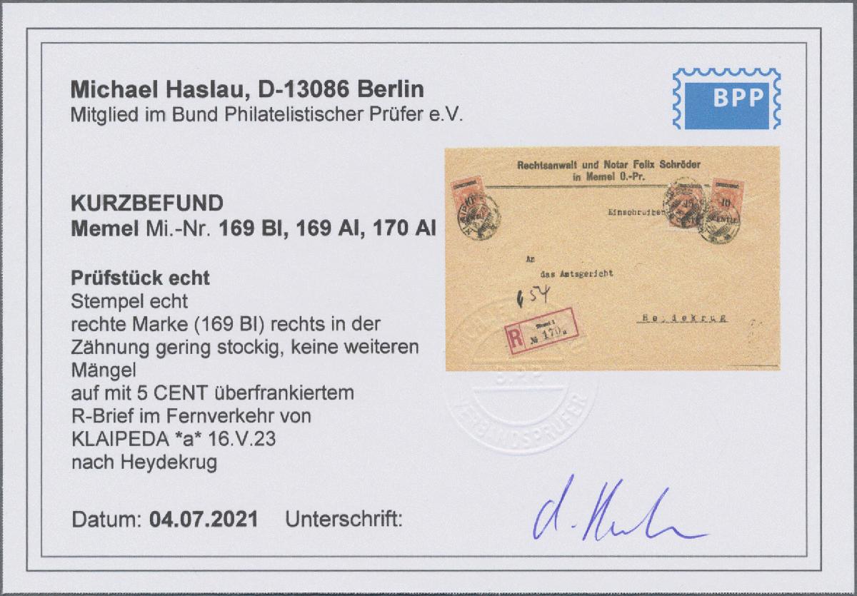 | Zusatzinformationen und Suchstichworte: | Christoph Gärtner 56. Auktion 12. - 16. Juni 2023 Los 5553 D Memel 1923, zweimal 10 C auf 25 M orange und 15 C auf 25 M orange, Freimarken, mit Tagesstempel "KLAIPEDA a, 16 V 23" auf mit 5 Cent überfrankiertem Einschreibbrief nach Heydekrug. Fotobefund Haslau BPP: "echt, Stempel echt, rechte Marke (169 BI) rechts in der Zähnung gering stockig". Ausruf GEBOT |