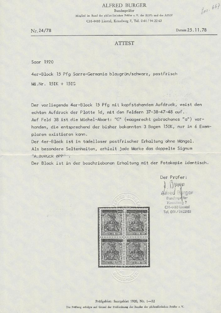 | Zusatzinformationen und Suchstichworte: | Christoph Gärtner 56. Auktion 12. - 16. Juni 2023 Los 5434 D Saar 1920, Sarre-Germania, 75 Pfg. im postfrischen Viererblock mit KOPFSTEHENDEM Aufdruck, eine Marke mit Plattenfehler "G" "waagerecht gebrochenes ´s ´", doppelt signiert Burger BPP und Fotoattest Burger BPP (Mi€2.000,-). Ausruf 300,00 EUR |
