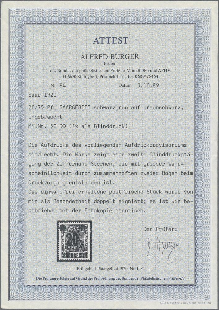 | Zusatzinformationen und Suchstichworte: | Christoph Gärtner 56. Auktion 12. - 16. Juni 2023 Los 5447 D Saar 1921, 20 auf 75 Pfg Germania, mit doppeltem Aufdruck der Sterne und der Wertziffer, davon einmal im BLINDDRUCK, tadellos postfrisch, seltene Besonderheit, Fotoattest Burger BPP. Ausruf 120,00 EUR |