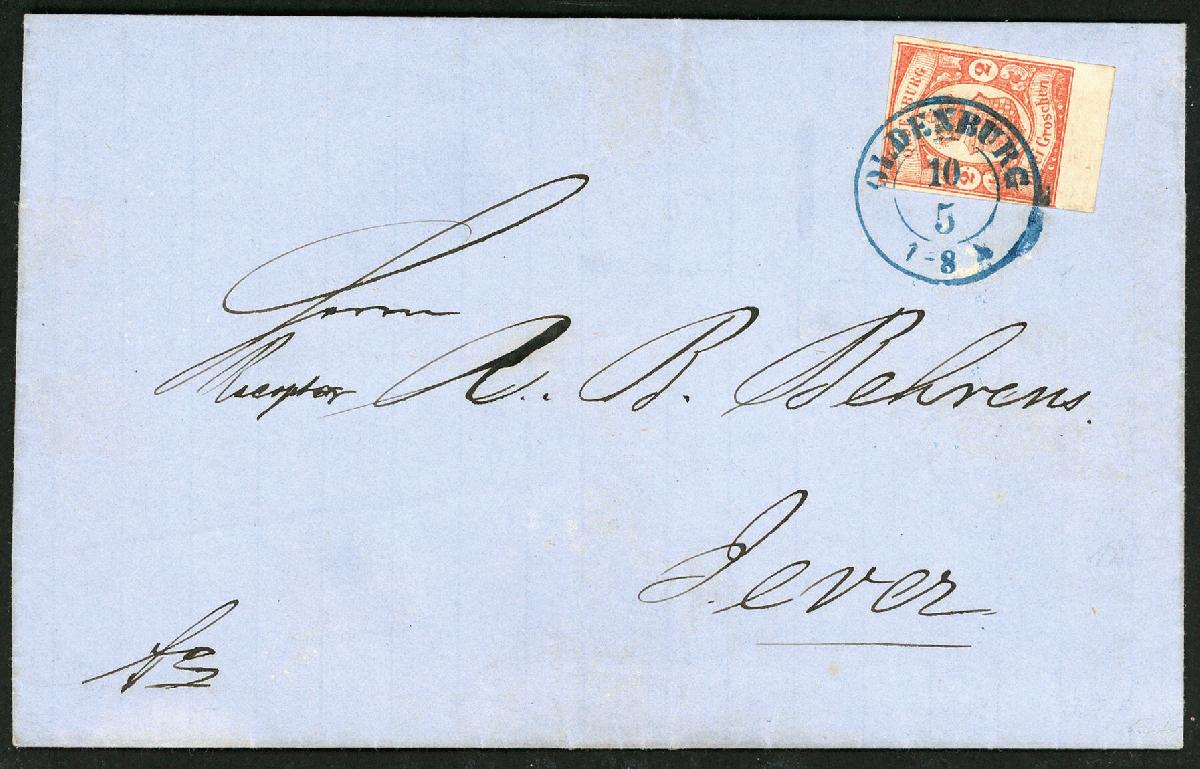 | Zusatzinformationen und Suchstichworte: | Klüttermann - 6. Auktion 27. Juli - 4. August 2023 Los 1459 Altdeutschland Oldenburg 2 Gr. zinnober, oben links minimal berührtes Unterrandstück mit 5mm Bogenrand auf dek. blauem Brief mit sauberen blauen K2 OLDENBURG 10 5 nach JEVER, FA Stegmüller (2022) Ausruf 1.000,00 EUR |