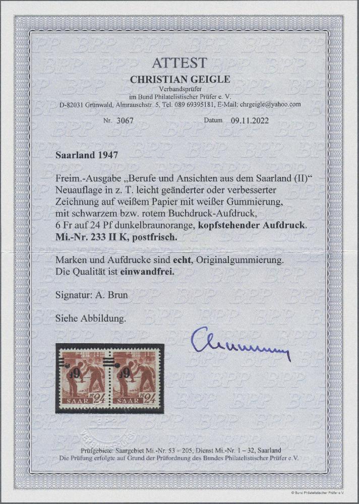 | Zusatzinformationen und Suchstichworte: | Christoph Gärtner 56. Auktion 12. - 16. Juni 2023 Los 6226 D Saarland 1947, 6 Fr auf 24 Pf. "Saar II", KOPFSTEHENDER Aufdruck im waagerechten Paar, tadellos vollzähnig in postfrischer Top-Erhaltung, Signiert Brun, Atteste Ney BPP und Geigle BPP. Ausruf 600,00 EUR |