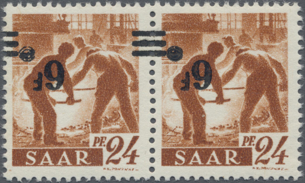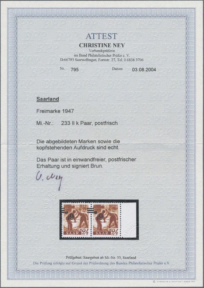 | Zusatzinformationen und Suchstichworte: | Christoph Gärtner 56. Auktion 12. - 16. Juni 2023 Los 6226 D Saarland 1947, 6 Fr auf 24 Pf. "Saar II", KOPFSTEHENDER Aufdruck im waagerechten Paar, tadellos vollzähnig in postfrischer Top-Erhaltung, Signiert Brun, Atteste Ney BPP und Geigle BPP. Ausruf 600,00 EUR |