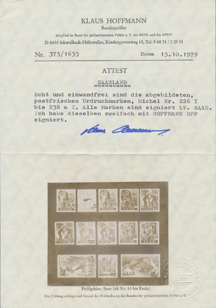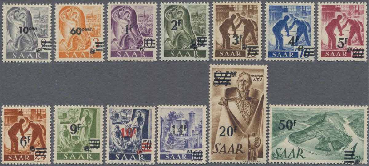 | Zusatzinformationen und Suchstichworte: | Christoph Gärtner 56. Auktion 12. - 16. Juni 2023 Los 6222 D Saarland 1947, Saar Urdruck 10 C - 50 Fr, 13 Werte komplett postfrisch, doppelt signiert Hoffmann und sign. LV Saar, laut FA Hoffmann echt und einwandfrei, Mi. 3500.- Zuschlag 750,00 EUR |