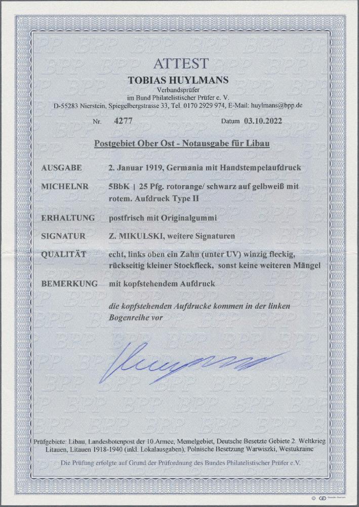 | Prüfgebiet: | Deutsche Besetzung WK 1 Postgebiet Ober Ost Libau |