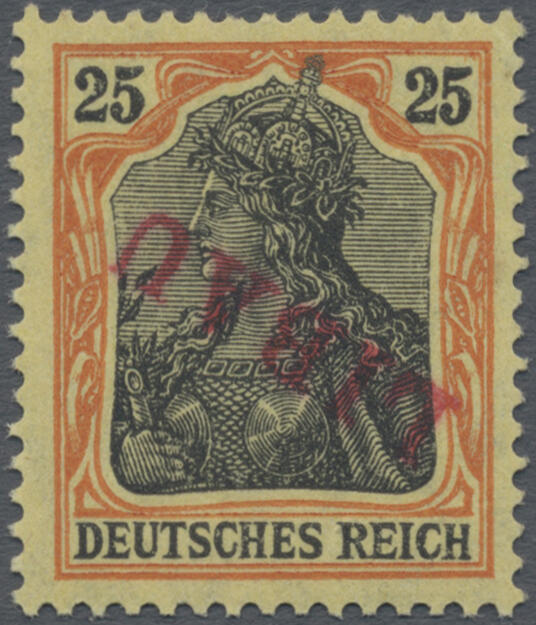 | Zusatzinformationen und Suchstichworte: | Christoph Gärtner 56. Auktion 12. - 16. Juni 2023 Los 5411 D Deutsche Besetzung I. WK Libau 1919, 25 Pf Germania mit kopfstehendem, rotem Aufdruck in Type II, postfrisch und vollzähnig mit punktgroßem Stockfleck, signiert u.a. Mikulski, Attest Huylmans Ausruf 250,00 EUR |
