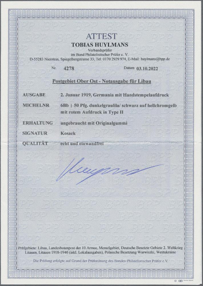 | Zusatzinformationen und Suchstichworte: | Christoph Gärtner 56. Auktion 12. - 16. Juni 2023 Los 5412 D Deutsche Besetzung I. WK Libau 1919, 50 Pf Germanie mit rotem Aufdruck in Type II, ungebraucht in tadellos vollzähniger Prachterhaltung, signiert Kosak, Attest Huylmans BPP. Ausruf 200,00 EUR |