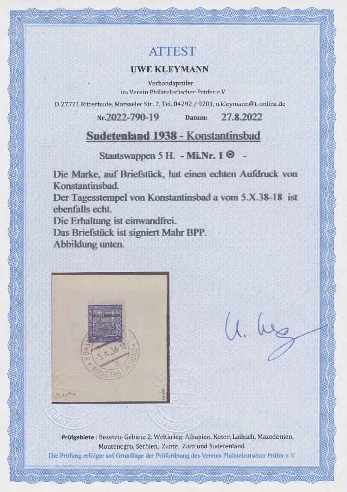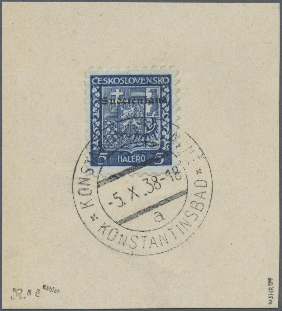 | Zusatzinformationen und Suchstichworte: | Christoph Gärtner 56. Auktion 12. - 16. Juni 2023 Los 5587 D Sudetenland Konstantinsbad 1938, Staatswappen 5 H. schwarzkobalt auf Briefstück, ideal entwertet "KONSTANTINSBAD -5.X.38", signiert Köhler und Mahr, BPP sowie mit aktuellem Foto-Attest Kleymann, VP(2022): "echt und einwandfrei". Die Auflage beträgt lediglich 100 Stück! Ausruf 350,00 EUR |