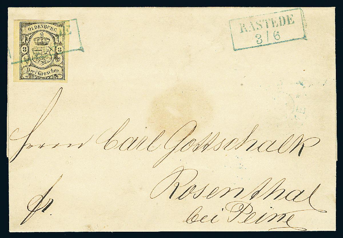 | Zusatzinformationen und Suchstichworte: | Dr. Derichs 171. Auktion 18. - 20. August 2023 Los 8912 Altdeutschland Oldenburg 3 Gr. schw./gelb, vierseitig voll- bis meist breitrandig geschnitten als Einzelfrankatur auf Postvereinsbrief mit blauem Ra2 "Rastede 3/6" (1861) auf der Marke und nochmals beigesetzt nach Rosenthal bei Peine/Königreich Hannover. Luxus. Neues Fotoattest Stegmüller BPP: "Ursprüngliche und feine, tadellose Erhaltung, nicht repariert.". (Michel 3.000.-) Ausruf 1.000,00 EUR |