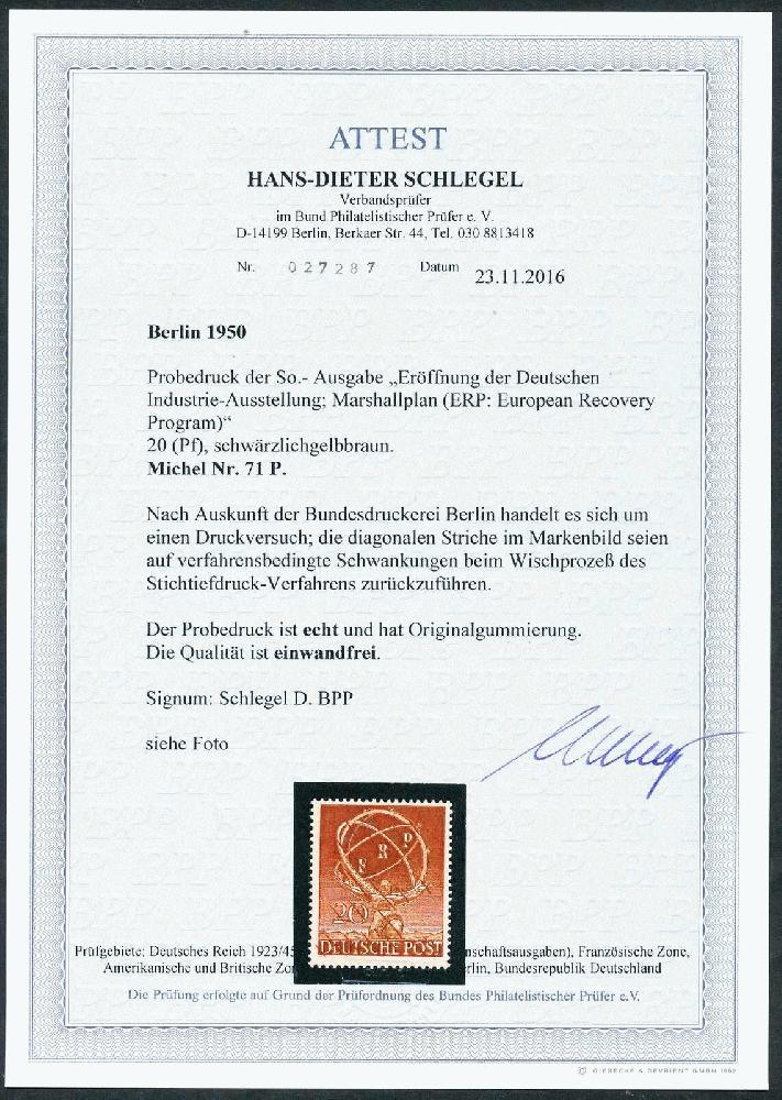 | Zusatzinformationen und Suchstichworte: | Auktionshaus Weiser 126. Fernauktion 14. Juli 2023 Los 2818 s Berlin Berlin 1950, ERP, Probedruck in Schwärzlichgelbbraun, mit den diagonalen Strichen, diese sind nach Angaben der Bundesdruckerei verfahrensbedingte Schwankungen beim Wischerprozeß dieses Druckversuches, postfrisch Pracht, Foto-Attest Schlegel BPP (postfr., Mi.-Nr. 71 P, Mi.EUR 1.000,--) Ausruf 250,00 EUR |