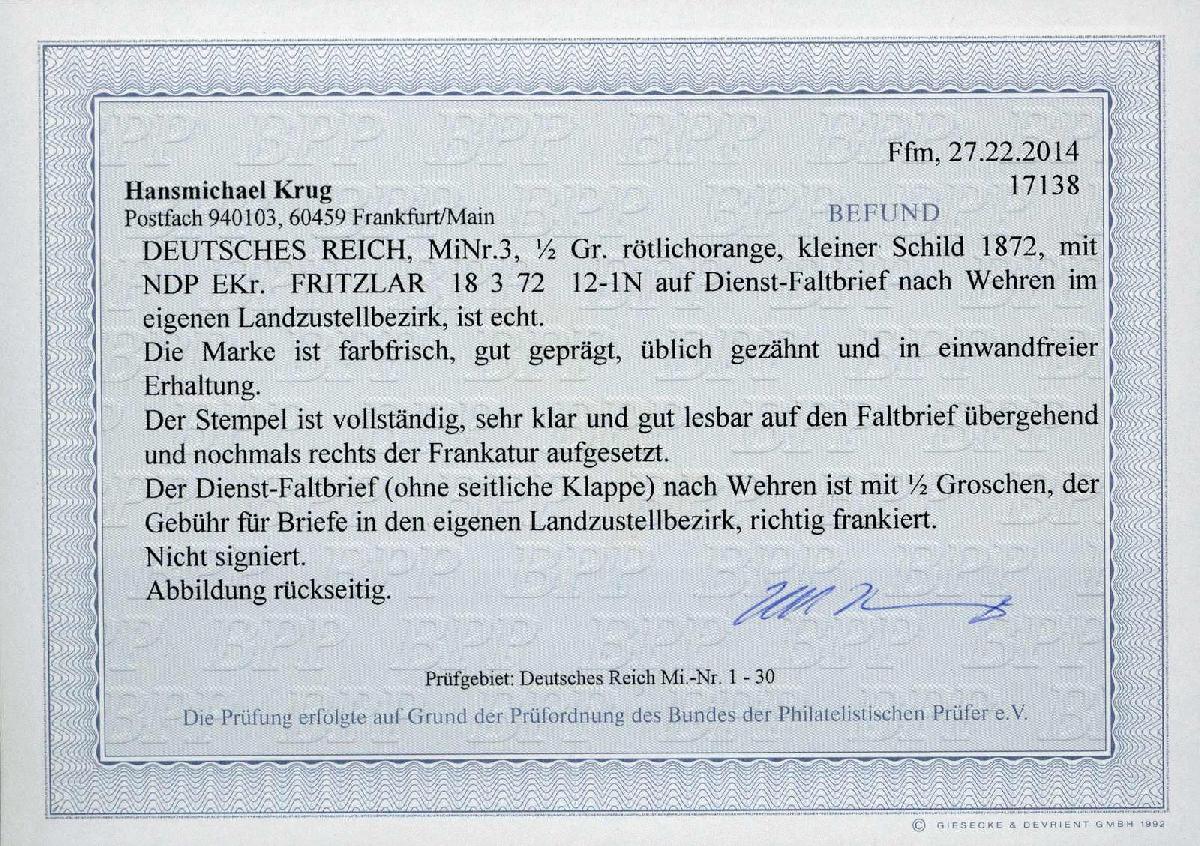 | Prüfgebiet: | Deutsches Reich 1871 - 1918 (Mi-Nr. 1 - 106) |