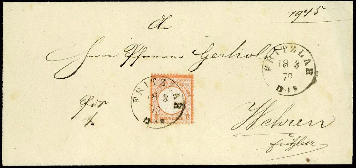 | Zusatzinformationen und Suchstichworte: | Veuskens 121. Auktion 10. - 11. August 2023 Los 1062 Altdeutschland Thurn und Taxis Fritzlar: herrl. klarer Ablöse-K1. auf Landbestell-Faltbriefhülle mit DR-Nr. 3. vom 18.3.1872 nach Wehren. Die Seitenklappen fehlen, insges. ein inters. Qualitätsstück mit ausführl. Befund Krug BPP Ausruf 80,00 EUR |
