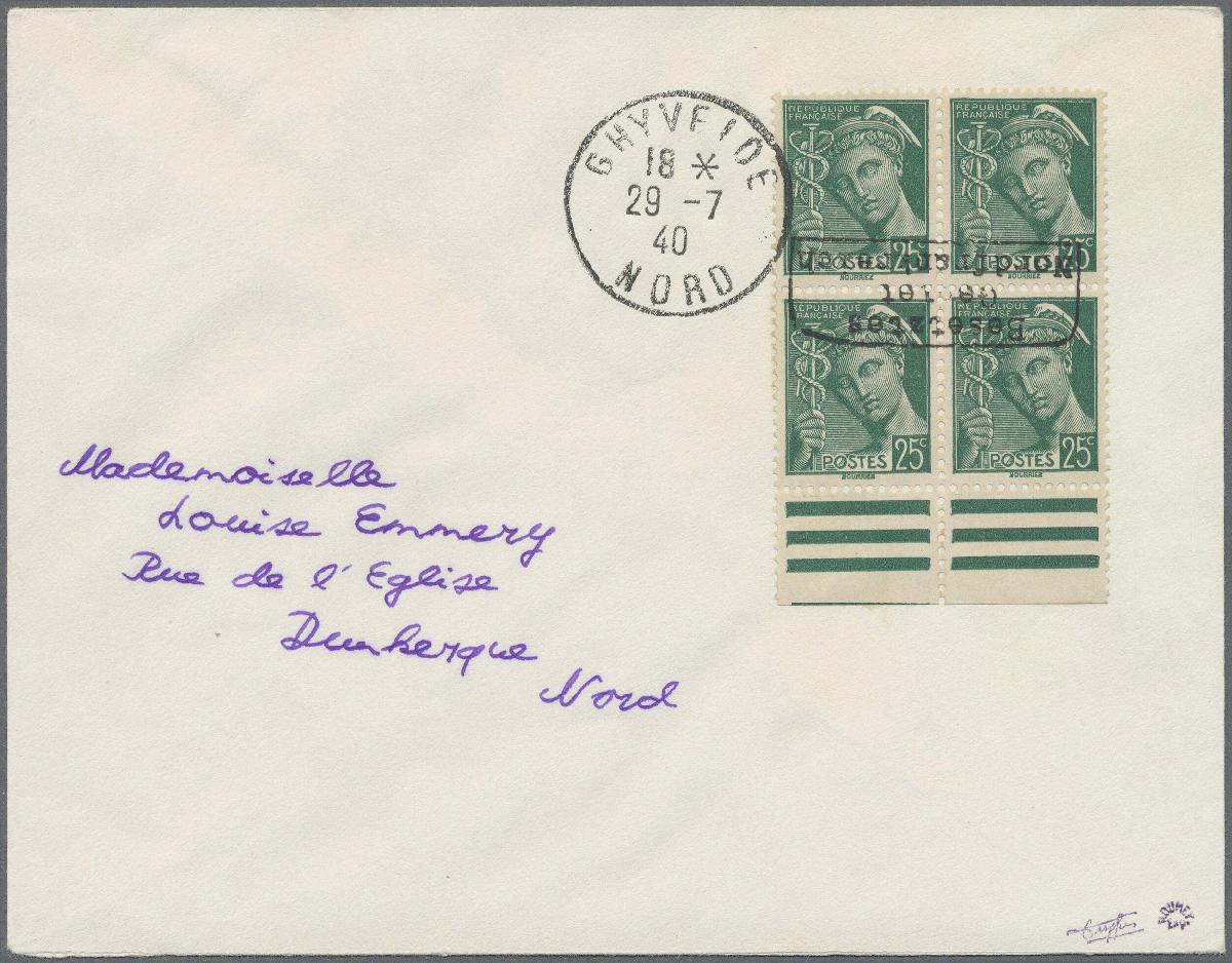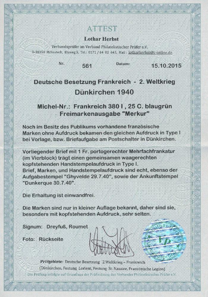 | Zusatzinformationen und Suchstichworte: | Christoph Gärtner 56. Auktion 12. - 16. Juni 2023 Los 5636 D Deutsche Besetzung II. WK Frankreich Dünkirchen 1940, 25 C schwärzlichopalgrün "Merkurkopf", Viererblock vom Unterrand , mit waagerechtem, mittig über alle vier Marken übergehenden KOPFSTEHENDEN Handstempelaufdruck in Type I, als portogerechte Mehrfachfrankatur auf Brief von GHYVELDE / NORD, 29-7 40, nach Dunkerque, tadellose Erhaltung. Die aus dem Besitz von Postkunden stammenden französischen Marken erhielten bei Vorlage am Postschalter den Handstempelaufdruck in Type I. Die so entstandenen Aufdruckmarken sind nur in SEHR GERINGER Stückzahl bekannt! GROSSE RARITÄT der deutschen Besetzungsausgaben im II. Weltkrieg. Signiert Dreyfus, Roumet, neuestes Fotoattest Lothar Herbst (10/2018) Ausruf 500,00 EUR |