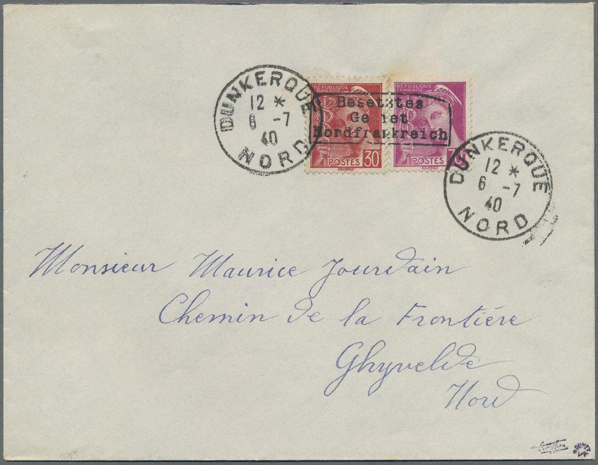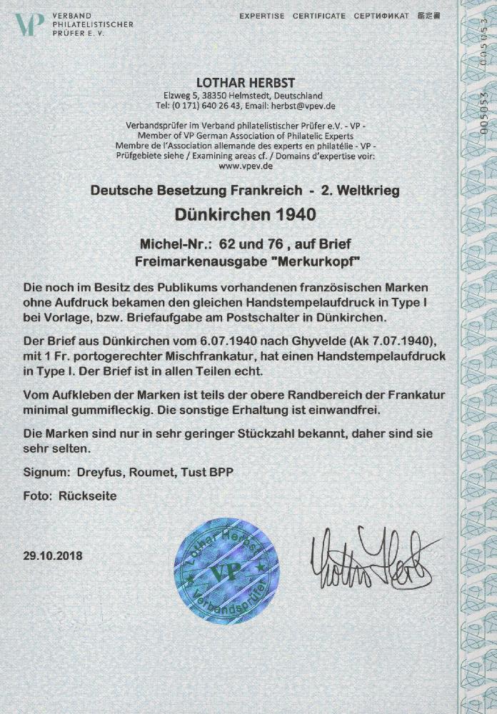 | Zusatzinformationen und Suchstichworte: | Christoph Gärtner 56. Auktion 12. - 16. Juni 2023 Los 5639 D Deutsche Besetzung II. WK Frankreich Dünkirchen 1940, 30 C dunkelrot Freimarke "Merkurkopf" und 70 C dunkellila Freimarke "Merkurkopf", mit waagerechtem, über beide Marken übergehenden Handstempelaufdruck in Type I, als portogerechte Mischfrankatur auf Brief von DUNKERQUE / NORD, 6-7 40, nach Ghyvelde, tadellose Erhaltung. Die aus dem Besitz von Postkunden stammenden französischen Marken erhielten bei Vorlage am Postschalter den Handstempelaufdruck in Type I. Die so entstandenen Aufdruckmarken sind nur in SEHR GERINGER Stückzahl bekannt! GROSSE RARITÄT der deutschen Besetzungsausgaben im II. Weltkrieg. Ausruf 200,00 EUR |