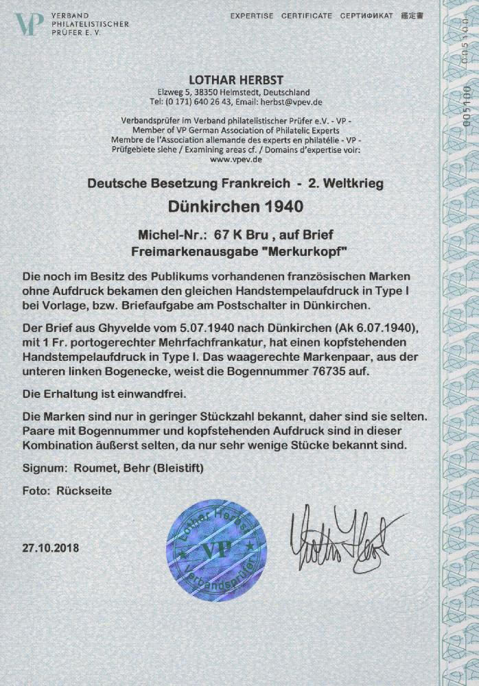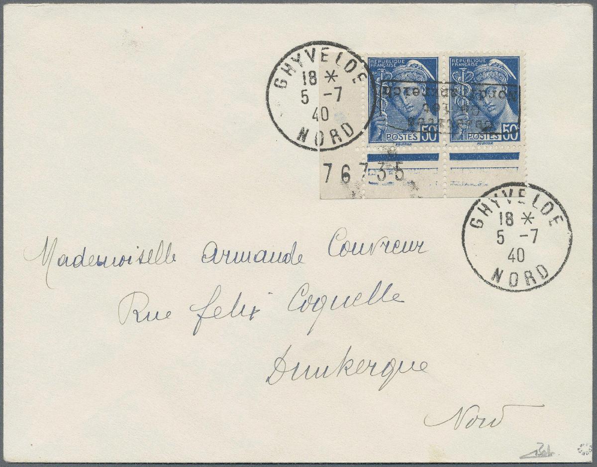 | Zusatzinformationen und Suchstichworte: | Christoph Gärtner 56. Auktion 12. - 16. Juni 2023 Los 5640 D Deutsche Besetzung II. WK Frankreich Dünkirchen 1940, 50 C schwärzlichblau "Merkurkopf", waagerechtes Paar von der linken unteren Bogenecke mit Bogenzählnummer, mit KOPFSTEHENDEM waagerechten Handstempelaufdruck in Type I, als portogerechte Mehrfachfrankatur auf Brief von GHYVELDE / NORD, 5-7-40, nach Dunkerque, tadellose Erhaltung. Die aus dem Besitz von Postkunden stammenden französischen Marken erhielten bei Vorlage am Postschalter den Handstempelaufdruck in Type I. Die so entstandenen Aufdruckmarken sind nur in SEHR GERINGER Stückzahl bekannt! GROSSE RARITÄT der deutschen Besetzungsausgaben im II. Weltkrieg. Ausruf 300,00 EUR |