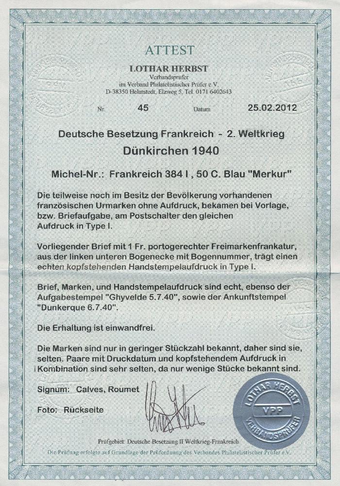 | Zusatzinformationen und Suchstichworte: | Christoph Gärtner 56. Auktion 12. - 16. Juni 2023 Los 5640 D Deutsche Besetzung II. WK Frankreich Dünkirchen 1940, 50 C schwärzlichblau "Merkurkopf", waagerechtes Paar von der linken unteren Bogenecke mit Bogenzählnummer, mit KOPFSTEHENDEM waagerechten Handstempelaufdruck in Type I, als portogerechte Mehrfachfrankatur auf Brief von GHYVELDE / NORD, 5-7-40, nach Dunkerque, tadellose Erhaltung. Die aus dem Besitz von Postkunden stammenden französischen Marken erhielten bei Vorlage am Postschalter den Handstempelaufdruck in Type I. Die so entstandenen Aufdruckmarken sind nur in SEHR GERINGER Stückzahl bekannt! GROSSE RARITÄT der deutschen Besetzungsausgaben im II. Weltkrieg. Ausruf 300,00 EUR |