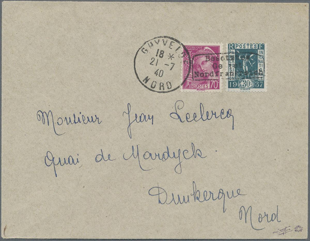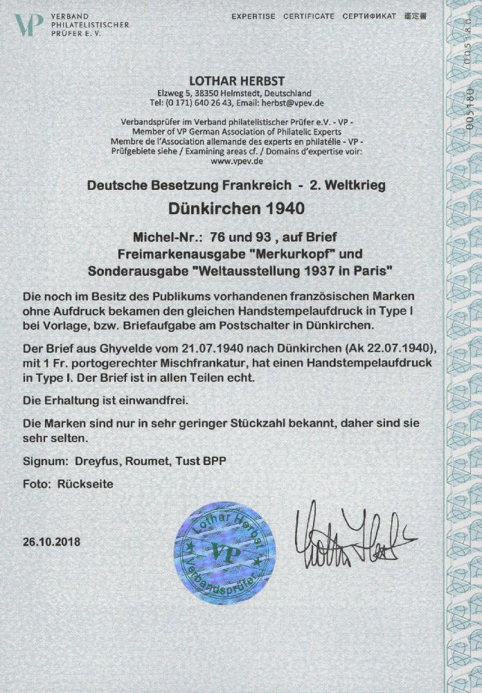 | Zusatzinformationen und Suchstichworte: | Christoph Gärtner 56. Auktion 12. - 16. Juni 2023 Los 5641 D Deutsche Besetzung II. WK Frankreich Dünkirchen 1940, 30 C dunkelgrünblau "Weltausstellung 1937" und 70 C dunkellila "Merkurkopf", mit waagerechtem, über beide Marken übergehenden Handstempelaufdruck in Type I, als portogerechte Mischfrankatur auf Brief von GHYVELDE / NORD, 21-7-40, nach Dunkerque, tadellose Erhaltung. Die aus dem Besitz von Postkunden stammenden französischen Marken erhielten bei Vorlage am Postschalter den Handstempelaufdruck in Type I. Die so entstandenen Aufdruckmarken sind nur in SEHR GERINGER Stückzahl bekannt! GROSSE RARITÄT der deutschen Besetzungsausgaben im II. Weltkrieg. Ausruf 300,00 EUR |