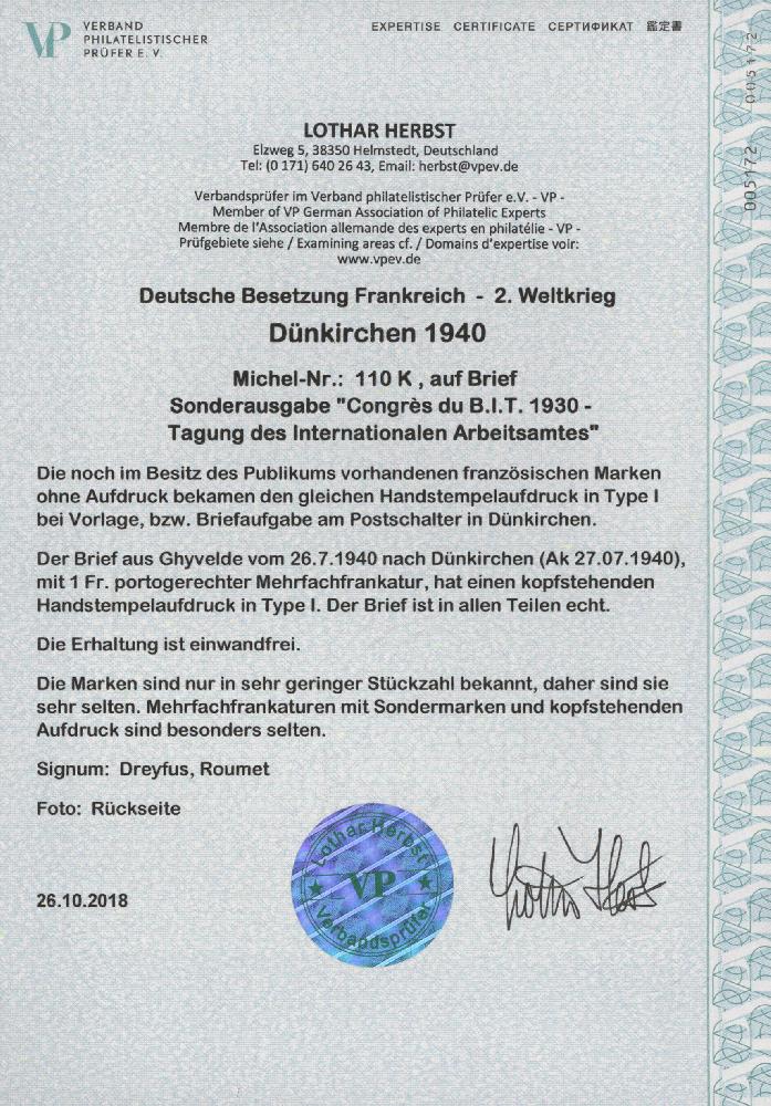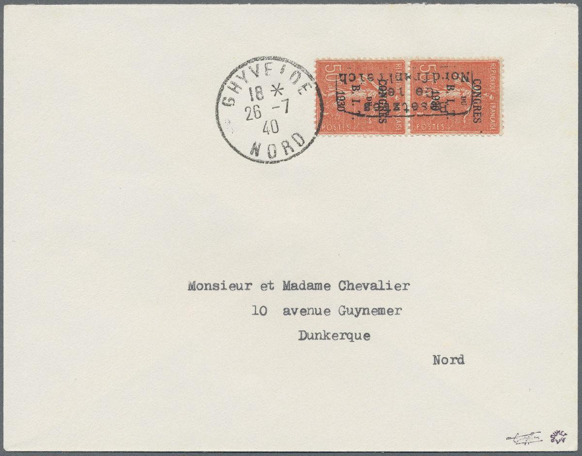 | Zusatzinformationen und Suchstichworte: | Christoph Gärtner 56. Auktion 12. - 16. Juni 2023 Los 5643 D Deutsche Besetzung II. WK Frankreich Dünkirchen 1940, 50 C dunkelorangerot "Congrès du B.I.T.", senkrechtes Paar, mit KOPFSTEHENDEM (von oben nach unten) Handstempelaufdruck in Type I, als portogerechte Mehrfachfrankatur auf Brief von GHYVELDE / NORD, 26-7-40, nach Dunkerque Nord, tadellose Erhaltung. Die aus dem Besitz von Postkunden stammenden französischen Marken erhielten bei Vorlage am Postschalter den Handstempelaufdruck in Type I. Die so entstandenen Aufdruckmarken sind nur in SEHR GERINGER Stückzahl bekannt! GROSSE RARITÄT der deutschen Besetzungsausgaben im II. Weltkrieg. Ausruf 600,00 EUR |