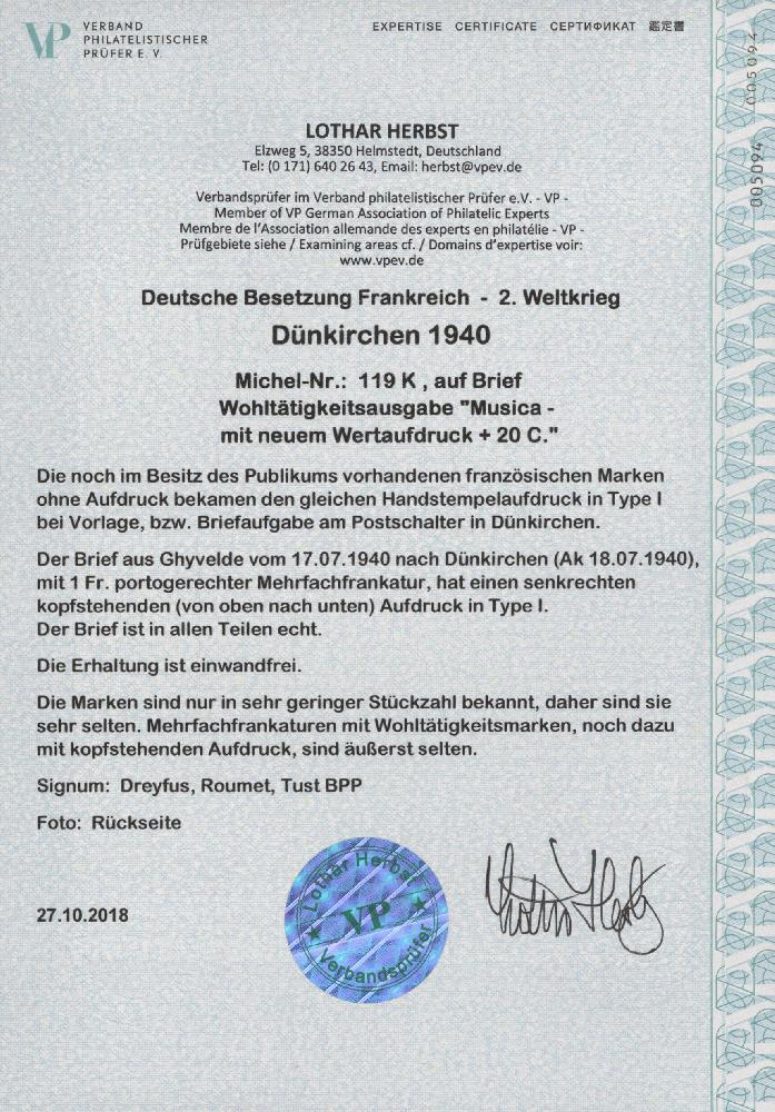 | Zusatzinformationen und Suchstichworte: | Christoph Gärtner 56. Auktion 12. - 16. Juni 2023 Los 5645 D Deutsche Besetzung II. WK Frankreich Dünkirchen 1940, 50 C + 2 Fr + 20 C dunkelzinnoberrot "Musica", senkrechtes Paar, mit über beide Marken übergehenden senkrechten KOPFSTEHENDEN (von oben nach unten) Handstempelaufdruck in Type I, als portogerechte Mehrfachfrankatur auf Brief von GHYVELDE / NORD, 17-7-40, nach Dunkerque Nord, tadellose Erhaltung. Die aus dem Besitz von Postkunden stammenden französischen Marken erhielten bei Vorlage am Postschalter den Handstempelaufdruck in Type I. Die so entstandenen Aufdruckmarken sind nur in SEHR GERINGER Stückzahl bekannt! GROSSE RARITÄT der deutschen Besetzungsausgaben im II. Weltkrieg. Zuschlag 350,00 EUR |