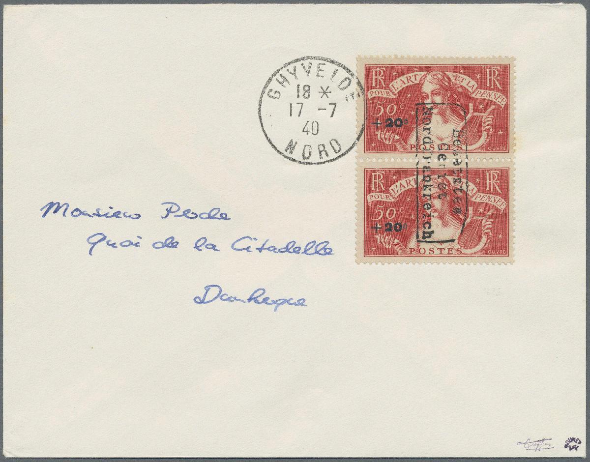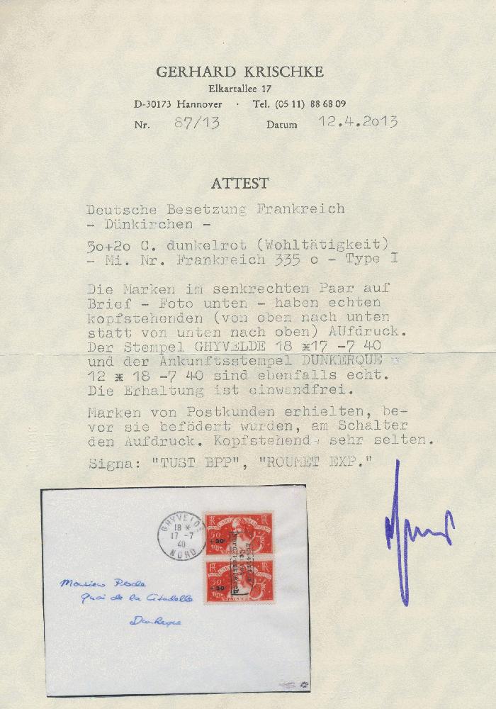 | Zusatzinformationen und Suchstichworte: | Christoph Gärtner 56. Auktion 12. - 16. Juni 2023 Los 5645 D Deutsche Besetzung II. WK Frankreich Dünkirchen 1940, 50 C + 2 Fr + 20 C dunkelzinnoberrot "Musica", senkrechtes Paar, mit über beide Marken übergehenden senkrechten KOPFSTEHENDEN (von oben nach unten) Handstempelaufdruck in Type I, als portogerechte Mehrfachfrankatur auf Brief von GHYVELDE / NORD, 17-7-40, nach Dunkerque Nord, tadellose Erhaltung. Die aus dem Besitz von Postkunden stammenden französischen Marken erhielten bei Vorlage am Postschalter den Handstempelaufdruck in Type I. Die so entstandenen Aufdruckmarken sind nur in SEHR GERINGER Stückzahl bekannt! GROSSE RARITÄT der deutschen Besetzungsausgaben im II. Weltkrieg. Zuschlag 350,00 EUR |