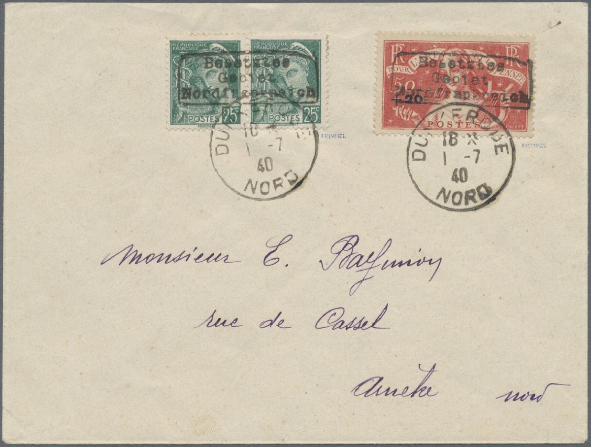 | Zusatzinformationen und Suchstichworte: | Christoph Gärtner 56. Auktion 12. - 16. Juni 2023 Los 5646 D Deutsche Besetzung II. WK Frankreich Dünkirchen 1940, 50c "Musica" gemeinsam mit waagerechtem Paar 25 c Merkurkopf mit jeweils waagerechtem Aufdruck, tarifrichtig auf sauberem Brief mit Ersttagsstempel "DUNKERQIE 1 - 7 40" nach Arnecke mit rückseitiger Ankunft 3.7.40 Ausruf 350,00 EUR |