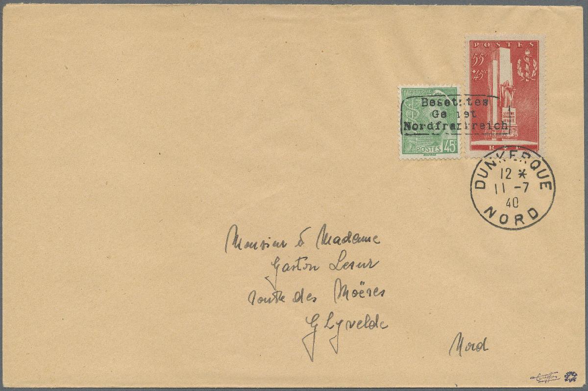 | Zusatzinformationen und Suchstichworte: | Christoph Gärtner 56. Auktion 12. - 16. Juni 2023 Los 5647 D Deutsche Besetzung II. WK Frankreich Dünkirchen 1940, 45 C schwärzlichsmaragdgrün "Merkurkopf" und 55 C + 45 C dunkelrot "Sanitätsdienst-Denkmal", mit waagerechtem, über beide Marken übergehenden Handstempelaufdruck in Type I, als portogerechte Mischfrankatur auf Brief von DUNKERQUE / NORD, 11-7 40, nach Ghyvelde, tadellose Erhaltung. Die aus dem Besitz von Postkunden stammenden französischen Marken erhielten bei Vorlage am Postschalter den Handstempelaufdruck in Type I. Die so entstandenen Aufdruckmarken sind nur in SEHR GERINGER Stückzahl bekannt! GROSSE RARITÄT der deutschen Besetzungsausgaben im II. Weltkrieg Ausruf 350,00 EUR |