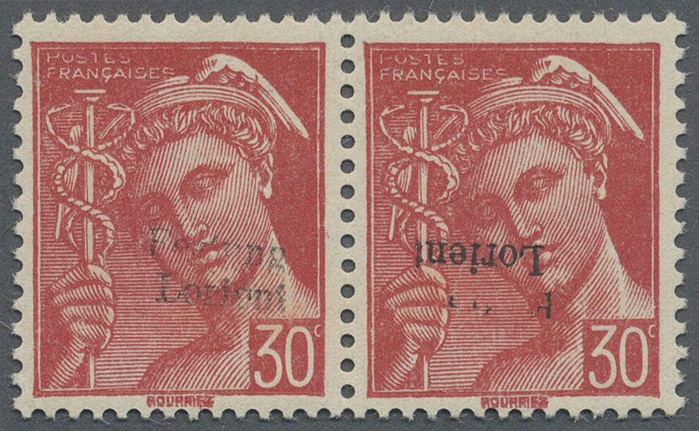 | Zusatzinformationen und Suchstichworte: | Christoph Gärtner 56. Auktion 12. - 16. Juni 2023 Los 5660 D Deutsche Besetzung II. WK Frankreich Lorient 1945, 30 C rot Merkurkopf, waagerechtes Paar, linke Marke mit normalem, rechte Marke mit KOPFSTEHENDEM Aufdruck "Festung Lorient", postfrisch mit vollem Originalgummi, tadellose Erhaltung. Kehrdruckpaare dieser Art sind SEHR SELTEN! Ausruf 600,00 EUR |