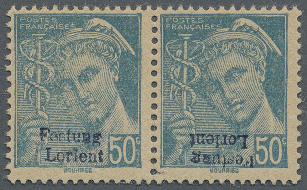 | Zusatzinformationen und Suchstichworte: | Christoph Gärtner 56. Auktion 12. - 16. Juni 2023 Los 5663 D Deutsche Besetzung II. WK Frankreich Lorient 1945, 50 C grünblau Merkurkopf, waagerechtes Paar, linke Marke mit normalem, rechte Marke mit KOPFSTEHENDEM Aufdruck "Festung Lorient", postfrisch mit vollem Originalgummi, tadellose Erhaltung. Kehrdruckpaare dieser Art sind SEHR SELTEN! Ausruf 500,00 EUR |