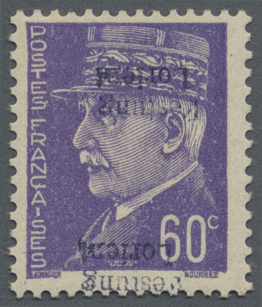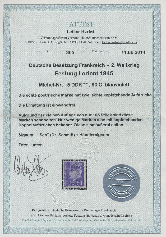 | Zusatzinformationen und Suchstichworte: | Christoph Gärtner 56. Auktion 12. - 16. Juni 2023 Los 5664 D Deutsche Besetzung II. WK Frankreich Lorient 1945, 60 C blauviolett Pétain, mit DOPPELTEM KOPFSTEHENDEN Aufdruck "Festung Lorient", postfrisch mit vollem Originalgummi, tadellose Erhaltung. Die Gesamtauflage beträgt nur 105 Stück - die wenigen Exemplare mit kopfstehenden Doppelaufdrucken sind ÄUßERST SELTEN! Ausruf 1.000,00 EUR |