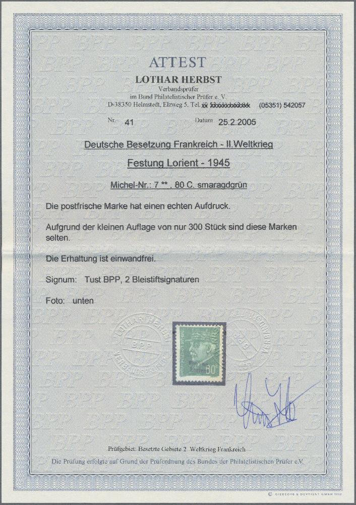 | Zusatzinformationen und Suchstichworte: | Christoph Gärtner 56. Auktion 12. - 16. Juni 2023 Los 5669 D Deutsche Besetzung II. WK Frankreich Lorient 1945, 80 c Petain, postfrisch in tadelloser Top-Qualität Zuschlag 300,00 EUR |