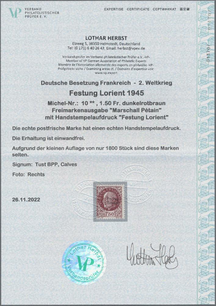 | Zusatzinformationen und Suchstichworte: | Christoph Gärtner 56. Auktion 12. - 16. Juni 2023 Los 5671 D Deutsche Besetzung II. WK Frankreich Lorient 1945, 1,50 Fr. Petain postfrisch in tadelloser Erhaltung Ausruf 150,00 EUR |