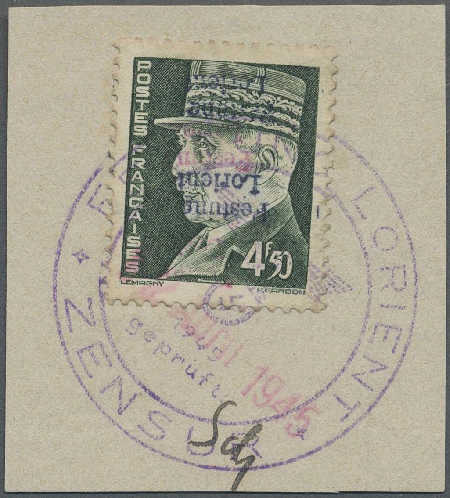 | Zusatzinformationen und Suchstichworte: | Christoph Gärtner 56. Auktion 12. - 16. Juni 2023 Los 5674 D Deutsche Besetzung II. WK Frankreich Lorient 1945, 4,50 Fr schwarzgrün Pétain, Marke mit DOPPELTEM KOPFSTEHENDEN Aufdruck "Festung Lorient" in den Farben dunkelblauviolett und dunkelrosakarmin, gestempelt mit violettem Zensurstempel "FESTUNG LORIENT / ZENSUR" und Datumsstempel (..).April 1945, auf Briefstück. Die Marke wurde zu Prüfzwecken gelöst und wieder befestigt, teils leicht getönt, sonst in guter Erhaltung. Bei einer Gesamtauflage von 70 Stück ist diese Aufdruck-Abart ÄUSSERST SELTEN! Ausruf 2.500,00 EUR |