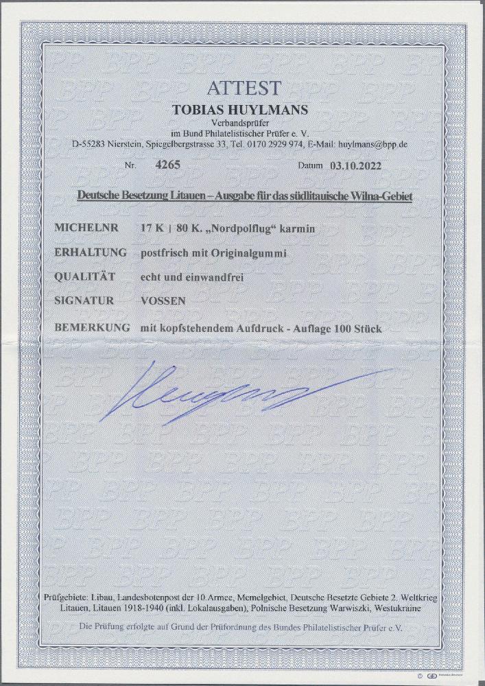 | Zusatzinformationen und Suchstichworte: | Christoph Gärtner 56. Auktion 12. - 16. Juni 2023 Los 5690 D Deutsche Besetzung II. WK Litauen 1941, 80 K "VILNIUS mit kopfstehendem Aufdruck in tadelloser postfrischer Luxuserhaltung Zuschlag 900,00 EUR |