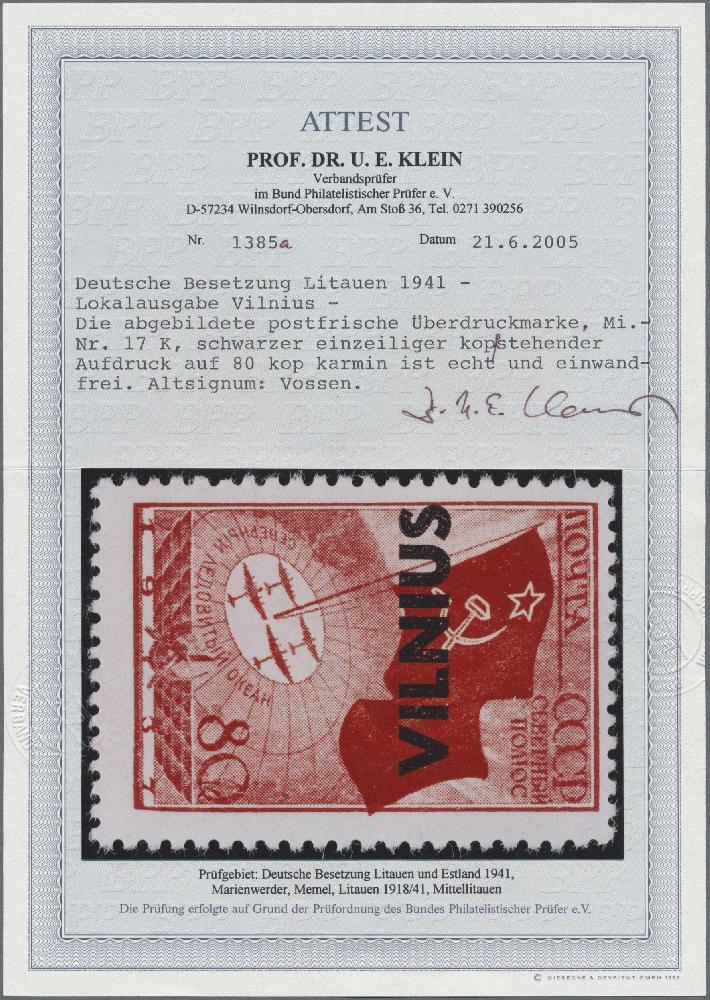 | Zusatzinformationen und Suchstichworte: | Christoph Gärtner 56. Auktion 12. - 16. Juni 2023 Los 5690 D Deutsche Besetzung II. WK Litauen 1941, 80 K "VILNIUS mit kopfstehendem Aufdruck in tadelloser postfrischer Luxuserhaltung Zuschlag 900,00 EUR |