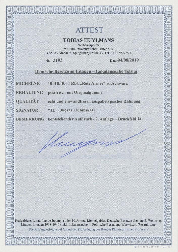 | Zusatzinformationen und Suchstichworte: | Christoph Gärtner 56. Auktion 12. - 16. Juni 2023 Los 5692 D Deutsche Besetzung II. WK Litauen Telsiai 1941, Aufdruck-Ausgabe, 1 R. mit Audruck "von oben nach unten", postfrisch, Foto-Attest Huylmans BPP (2019): "echt und einwandfrei", Mi 1000,- Zuschlag 180,00 EUR |