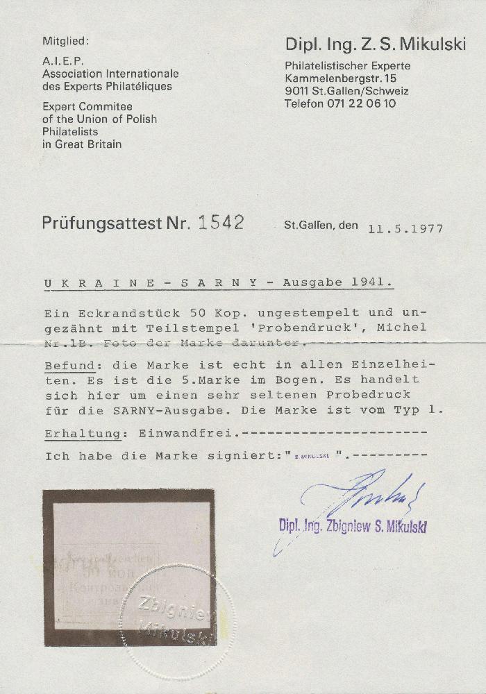 | Zusatzinformationen und Suchstichworte: | Christoph Gärtner 56. Auktion 12. - 16. Juni 2023 Los 5701 D Deutsche Besetzung II. WK Ukraine Sarny 1941, 50 K schwarz auf dunkelblaugrau, Type I, ungezähnt von der rechten oberen Bogenecke mit Aufdruck "Probendruck", wie hergestellt ohne Gummierung in einwandfreier Erhaltung. Äußerst seltene Marke aus Vorlagebogen stammend - Auflage nur 15 Stück. Große Rarität der deutschen Besetzungsausgaben im II. Weltkrieg Ausruf 3.000,00 EUR |