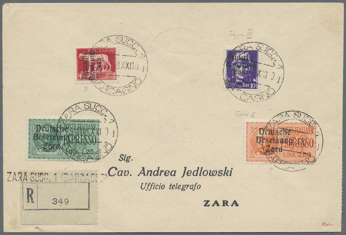 | Zusatzinformationen und Suchstichworte: | Christoph Gärtner 56. Auktion 12. - 16. Juni 2023 Los 5713 D Deutsche Besetzung II. WK Zara 1943, 5 Lire dunkelrosarot mit Aufdruck Type II und 10 Lire dunkelbläulichviolett mit Aufdruck Type III, sowie die beiden Eilmarken 1,25 Lire grün und 2,50 Lire rotorange (Feld 8), alle Marken entwertet mit Stempel ZARA SUCC.1 / BARCAGNO, 23.10.43, zusammen auf handschriftlich im Ortsverkehr adressierten Einschreibe-Briefumschlag. Die Auflage der 10 Lire Marke mit Aufdruck in Type III beträgt nur ca. 40 Stück! GROSSE RARITÄT der deutschen Besetzungsausgaben im II. Weltkrieg Ausruf 1.300,00 EUR |