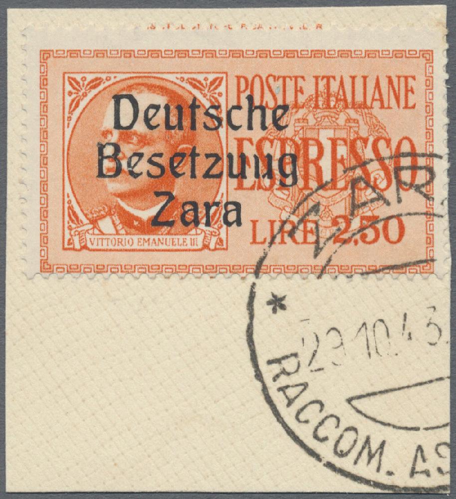 | Zusatzinformationen und Suchstichworte: | Christoph Gärtner 56. Auktion 12. - 16. Juni 2023 Los 5716 D Deutsche Besetzung II. WK Zara 1943, 2,50 Lire rotorange Eilmarke, Aufdruck mit Setzfehler "Besetzuug" statt Besetzung vom Feld 6 der Überdruckplatte, entwertet mit Teilstempel ZAR(A) / RACCOMM. ASSICURATE, 23.10.43, auf Briefstück, tadellose Erhaltung. RARITÄT der deutschen Besetzungsausgaben im II. Weltkrieg Ausruf 300,00 EUR |