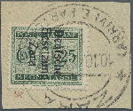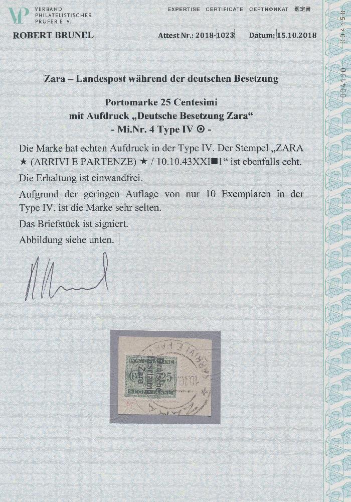 | Zusatzinformationen und Suchstichworte: | Christoph Gärtner 56. Auktion 12. - 16. Juni 2023 Los 5721 D Deutsche Besetzung II. WK Zara 1943, 25 C schwärzlichsmaragdgrün, Aufdruck Type IV, entwertet mit Stempel ZARA / ARRIVI E PARTENZE, 10.10.43, auf Briefstück, tadellose Erhaltung. Die Auflage dieser Marke mit Aufdruck in Type IV beträgt nur 10 Stück! ALLERGRÖSSTE SELTENHEIT der deutschen Besetzungsausgaben im II. Weltkrieg Ausruf 2.000,00 EUR |
