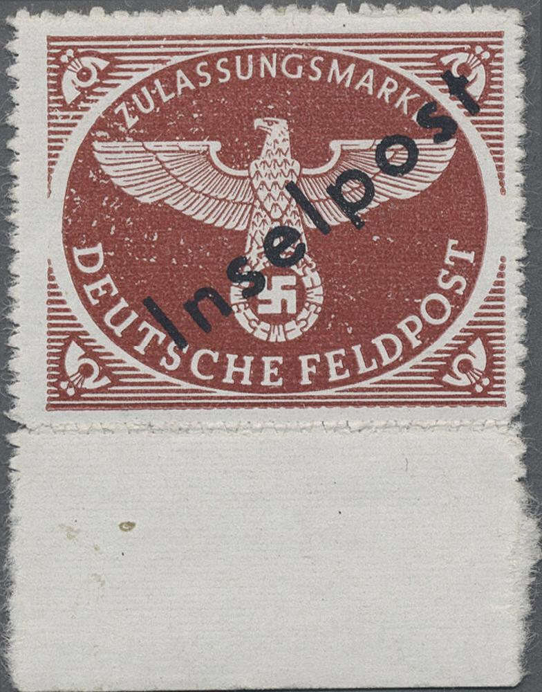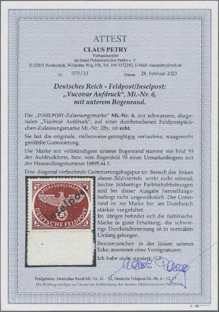 | Zusatzinformationen und Suchstichworte: | Christoph Gärtner 56. Auktion 12. - 16. Juni 2023 Los 5728 D Deutsche Besetzung II. WK, Feldpostmarken 1944, Vukovar Zulassungsmarke durchstochen, sie hat die originale, stellenweise gering verlaufene, waagerecht geriffelte Gummierung. Die Marke mit vollständigem unteren Bogenrand stammt von Feld 93 der Aufdruckform bzw. vom Bogenfeld 93 eines Urmarkenbogens mit der Hausaufrtagsnummer 18895.445. Eine diagonal verlaufende Gummierungsbugspur im Bereich des linken oberen Bildviertels wirkt nicht störend, leichte bildseitige bildseitige Farbhaftabhebungen sind bei dieser Ausgabe herstellungsbedingt nicht ungewöhnlich. Der Unterrand ist zur Marke hin am Durchstich stärker vorgefaltet. Im übrigen befindet sich die farbfrische Marke in guter Erhaltung, die schwierige Durchstichtrennung ist in normalem Umfang gelungen, Fotoattest Petry BPP (Mi€2.000,-). Ausruf 500,00 EUR |