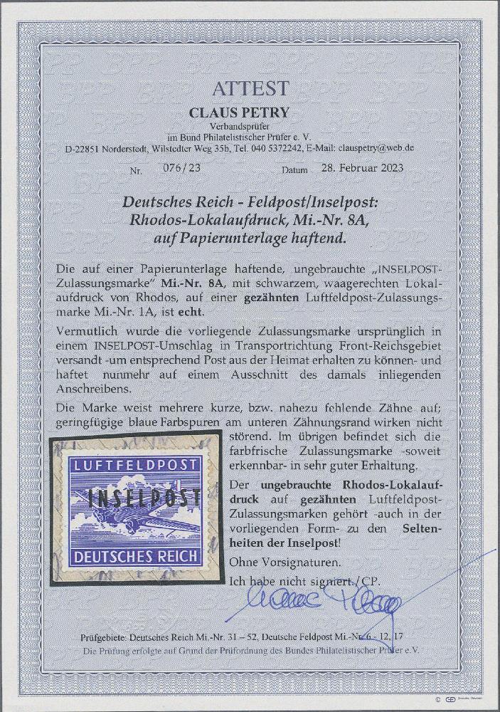 | Zusatzinformationen und Suchstichworte: | Christoph Gärtner 56. Auktion 12. - 16. Juni 2023 Los 5729 D Deutsche Besetzung II. WK, Feldpostmarken 1944, Insel Rhodos, INSELPOST-Zulassungsmarke mit Lokalaufdruck Rhodos auf gezähnter Urmarke MiNr. 1 A, hier auf einer Papierunterlage haftend. Vermutlich wurde die vorliegende Zulassungsmarke ursprünglich in einem Inselpost-Umschlag in das Reichsgebiet versandt - um entsprechende Post aus der Heimat erhalten zu können - und haftet nun auf einem Ausschnitt des inliegenden Anschreibens. Die Marke weist mehrere kurze bzw. nahezu fehlende Zähne auf, geringfügige blaue Farbspuren am Unterrand wirken nicht störend. Im übrigen befindet sich die farbfrische Zulassungsmarke in sehr guter Erhaltung. Der ungebrauchte Rhodos-Lokalaufdruck auf gezähnten Zulassungsmarken gehört - auch in der vorliegenden Form - zu den Seltenheiten der Inselpost, Fotoattest Petry BPP (Mi€für*8.500,-). Ausruf 1.000,00 EUR |