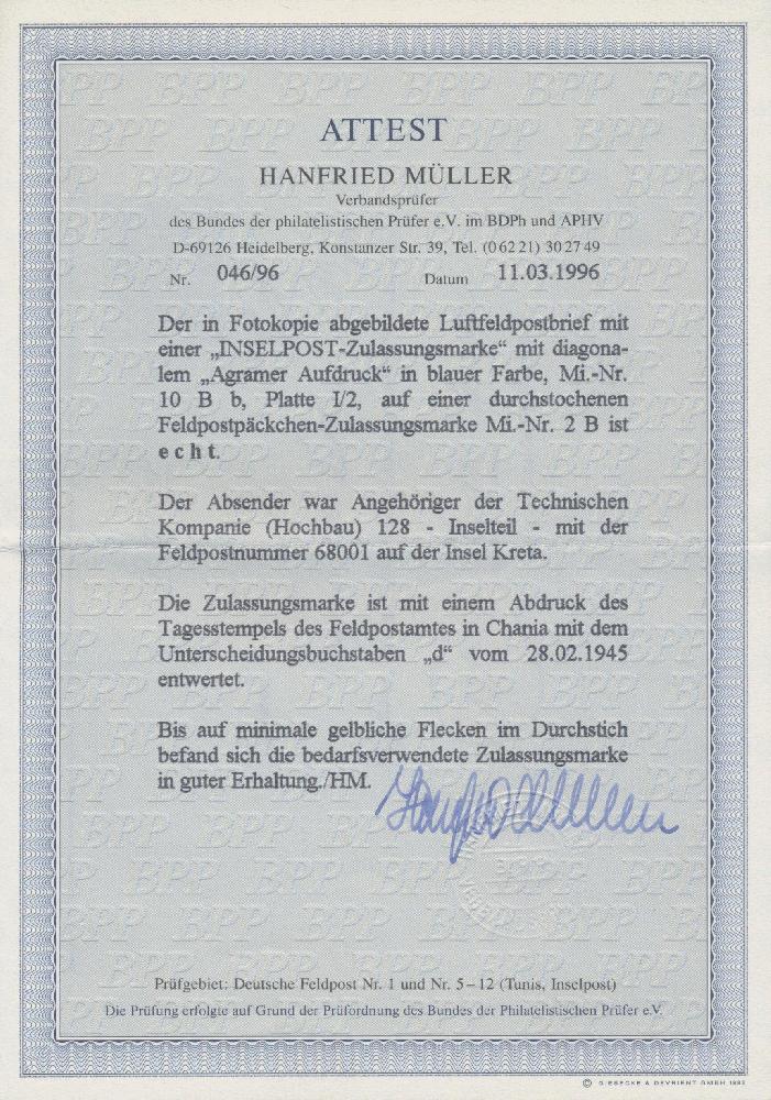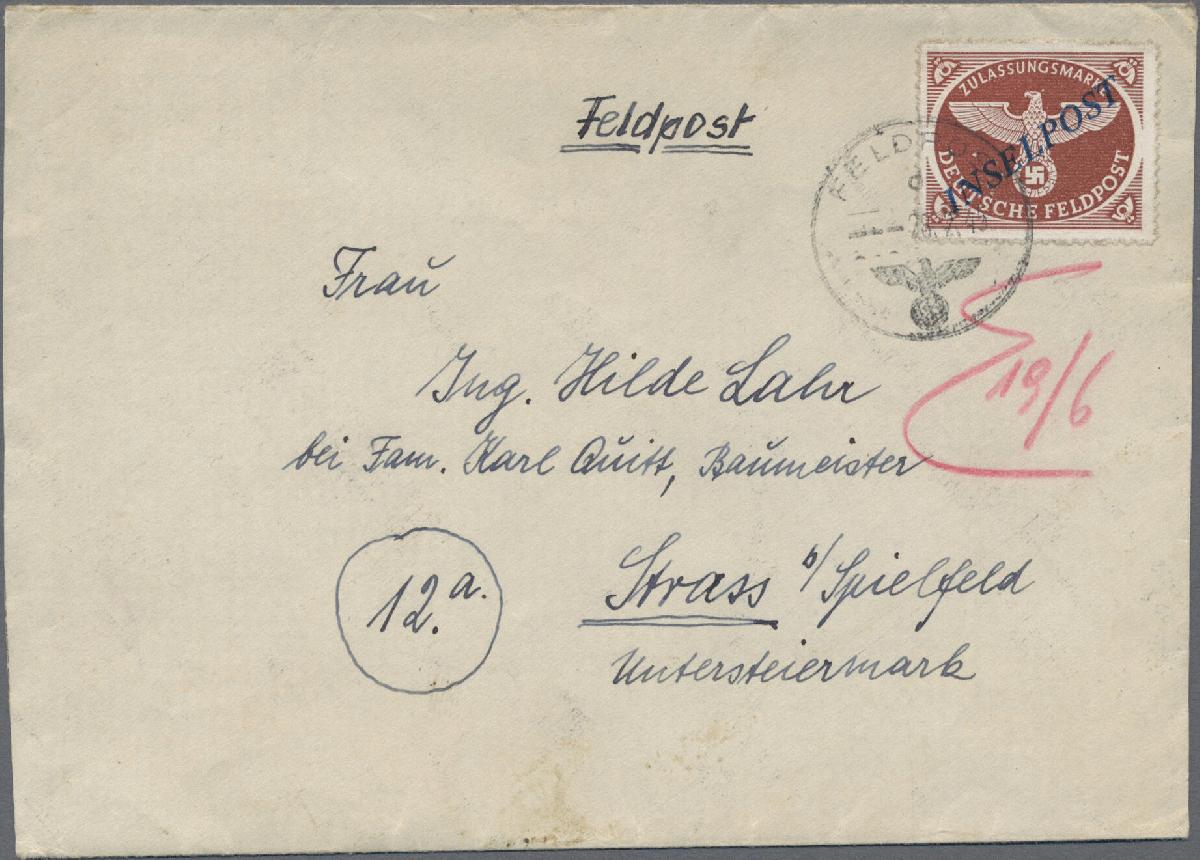 | Zusatzinformationen und Suchstichworte: | Christoph Gärtner 56. Auktion 12. - 16. Juni 2023 Los 5731 D Deutsche Besetzung II. WK, Feldpostmarken 1945, Inselpost-Zulassungsmarke (Agramer Aufdruck) auf Feldpost-Brief, mit FP-Normstempel "d" (28.2.) und Abs. 68001 Angehöriger der Technischen Kompanie (Hochbau) 128 Inselteil/Insel Kreta nach (12a) Strass b. Spielfeld, Untersteiermark Ausruf 180,00 EUR |