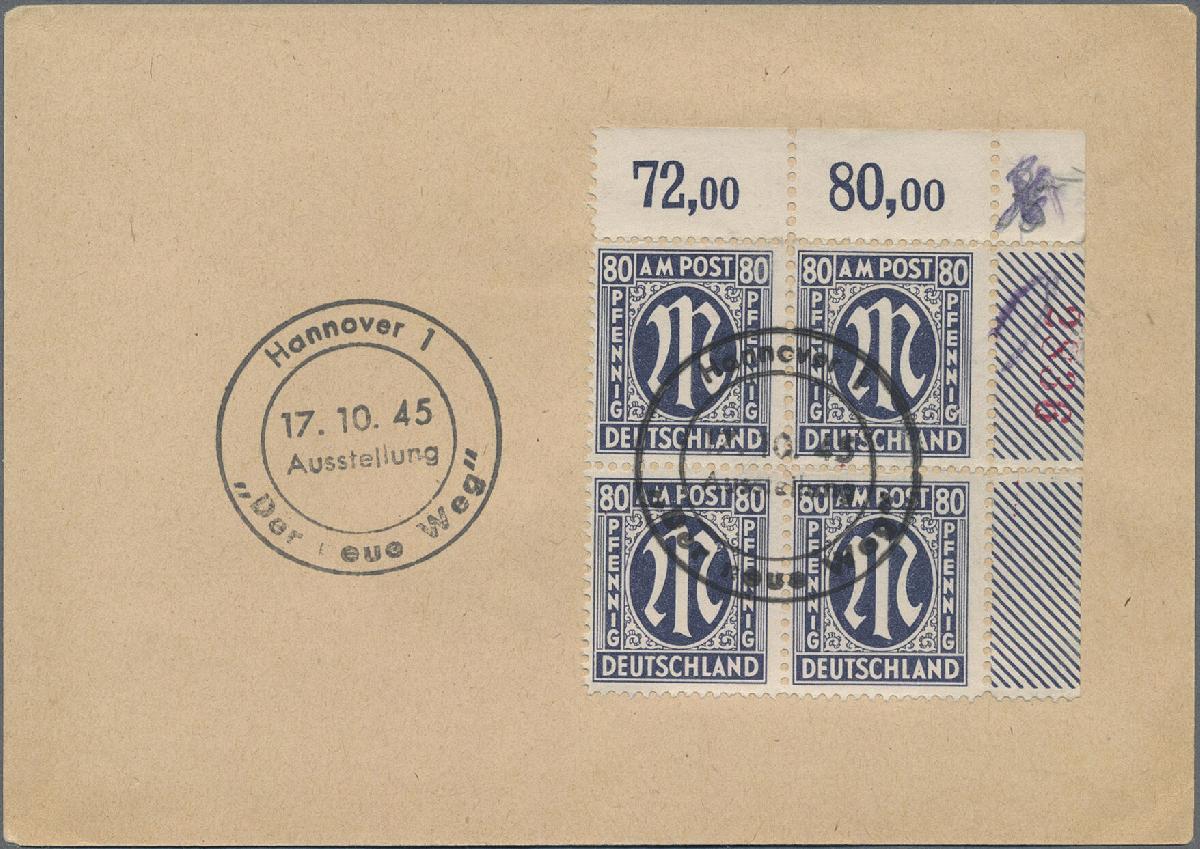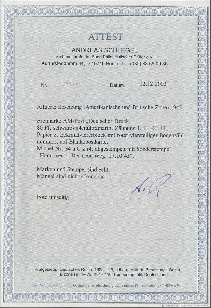 | Zusatzinformationen und Suchstichworte: | Christoph Gärtner 56. Auktion 12. - 16. Juni 2023 Los 6276 D Bizone 1945 80 Pf. schwarzviolettultramarin, gez. L 11½:11, Papier z, Eckrand-4er-Block rechts oben mit roter Bogennummer "2836" im rechten Rand der Eckmarke, zentrisch entwertet mit Sonderstempel "HANNOVER 1 "Der neue Weg" 17.10.45 Ausstellung", rückseitig auf Blankopostkarte mit weiterem Stempelabschlag, in tadelloser Erhaltung. Attest A. Schlegel BPP (Mi. für Randmarke mit Bogenzählnummer 2200,- für gestempelt, 3200,- € auf Brief, und dazu 3 gestempelte Werte zu je 300,- €) Zuschlag 600,00 EUR |