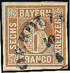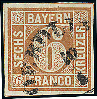 | Zusatzinformationen und Suchstichworte: | 114. Kirstein-Larisch Auktion 1. - 3. Juni 2023 Los 48 Altdeutschland Bayern 6 Kr. dkl'braunorange, Type I, farbfrisch u. alls. voll-/ breitrandig (2½ SL), gest. Kab.- Stück, sign. Richter, gepr. Bühler, Foto- Kurzbefund Sem Zuschlag 45,00 EUR |