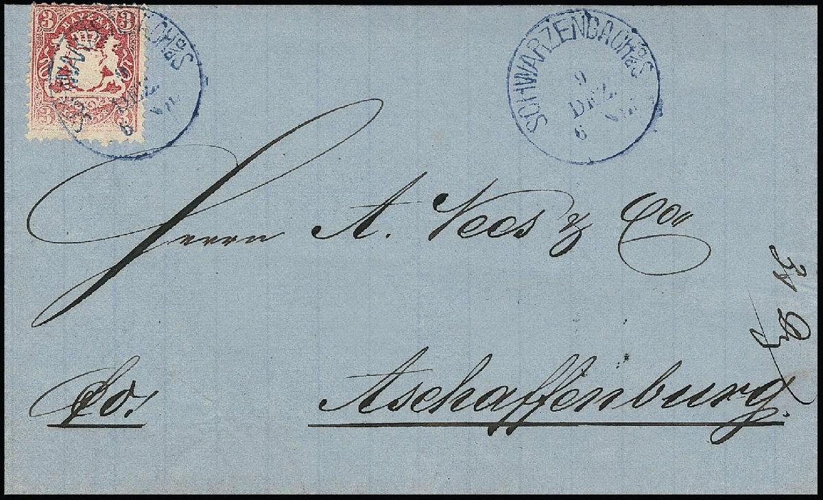 | Zusatzinformationen und Suchstichworte: | Rauhut & Kruschel - 218. Auktion 10. Juni 2023 Los 227 Altdeutschland Bayern 3 Kr. rosa (oben etwas bestoßen) mit nur kleinen Wasserzeichen-Teilen und zudem unten ausgefallenem Druck (durch schwachen Farbauftrag) auf Brief mit blauem K1 "Schwarzenbach a.d.S." Ausruf 60,00 EUR |