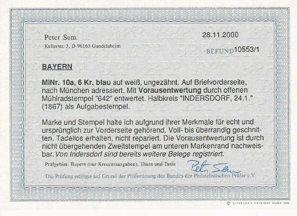 | Zusatzinformationen und Suchstichworte: | Rauhut & Kruschel - 218. Auktion 10. Juni 2023 Los 328 Altdeutschland Bayern "642", der oMR als Vorausentwertung, nebst HK "Indersdorf", auf Brief (rs. nur ein Klappenteil) mit Kabinettstück 6 Kr. blau. Vorausentwertungen von diesem Ort sind vergleichsweise selten! Ausruf 250,00 EUR |