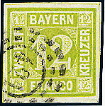 | Zusatzinformationen und Suchstichworte: | 114. Kirstein-Larisch Auktion 1. - 3. Juni 2023 Los 87 Altdeutschland Bayern 12 Kr. dkl'gelbgrün, farbfrisch u. alls. breitrandig (3 SL), Kab.- Stück mit oMR "421" (Reichenhall), gepr. Brettl, Foto- Kurzbefund Sem Zuschlag 36,00 EUR |