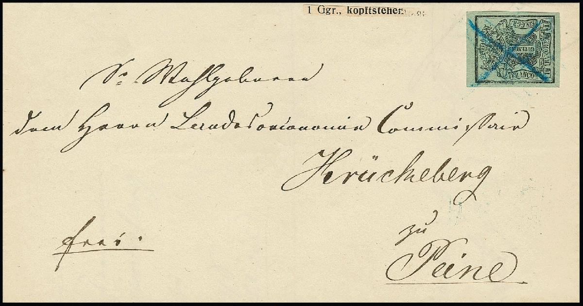 | Zusatzinformationen und Suchstichworte: | Rauhut & Kruschel - 218. Auktion 10. Juni 2023 Los 508 Altdeutschland Hannover 1 Ggr. schw./meergrün, kopfstehendes Wasserzeichen, nur mit Federkreuz und Blaustrich (teils radiert) entwertet, breitrandig auf Brief aus Vienenburg 1855. Die meergrüne 1 Ggr. mit kopfstehendem Wasserzeichen ist auf Brief sehr selten! Ausruf 250,00 EUR |
