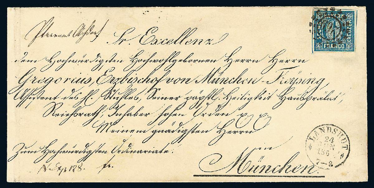 | Zusatzinformationen und Suchstichworte: | 114. Kirstein-Larisch Auktion 1. - 3. Juni 2023 Los 148 Altdeutschland Bayern GREGOR VON SCHERR, vorgedruckter Prachtbrief (gebrochene Faltung hinterklebt) der 2. Gewichtsstufe mit 6 Kr. blau u. klarem oMR "269" mit beiges. K2 "LANDSHUT 24 JUN 186(5)" nach "MÜNCHEN 25 JUN 1865", Fotoattest Stegmüller: "Ein dekoratives Ganzstück." Ausruf 270,00 EUR |
